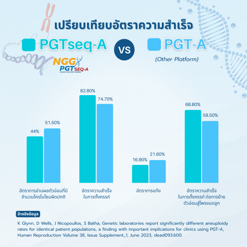 - อัตราความสำเร็จของในการตั้งครรภ์ รวมถึงอัตราความสำเร็จของการตั้งครรภ์ต่อรอบการย้ายตัวอ่อนของ PGTseq-A “สูงกว่า” PGT-A (Other Platform)